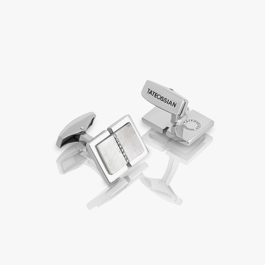 Classic London Eye Cufflinks in Rhodium Plated Silver with White Diamonds and MOP
