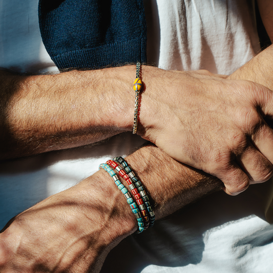 Combining colours, metals, and themes, reminiscent of the occasion has never been easier with our bracelets for men – whether it is for the beach or the bar, for the office or the opera – stacking three, four, five or more men's bracelets will symbolise confidence, empathy, a spirit of adventure, and a journey of discovery. This can create a statement or add a touch of class to basic daily outfits. No matter what combination is used, every man is bound to stand out and exude confidence when stacking our bracelets!