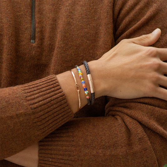 Combining colours, metals, and themes, reminiscent of the occasion has never been easier with our bracelets for men – whether it is for the beach or the bar, for the office or the opera – stacking three, four, five or more men's bracelets will symbolise confidence, empathy, a spirit of adventure, and a journey of discovery. This can create a statement or add a touch of class to basic daily outfits. No matter what combination is used, every man is bound to stand out and exude confidence when stacking our bracelets!
