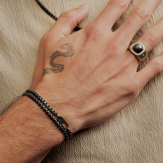 Our Giza Box Chain Bracelet is available in both stainless steel and black gunmetal plated options, so you can opt for a classic silver colour or striking black. The textured appearance of this design has been inspired by the pyramids in Egypt, all complete with a chunky box chain that makes for a contemporary style. In fact, we recommend stacking this chain with our colourful beaded bracelets to create a unique look.