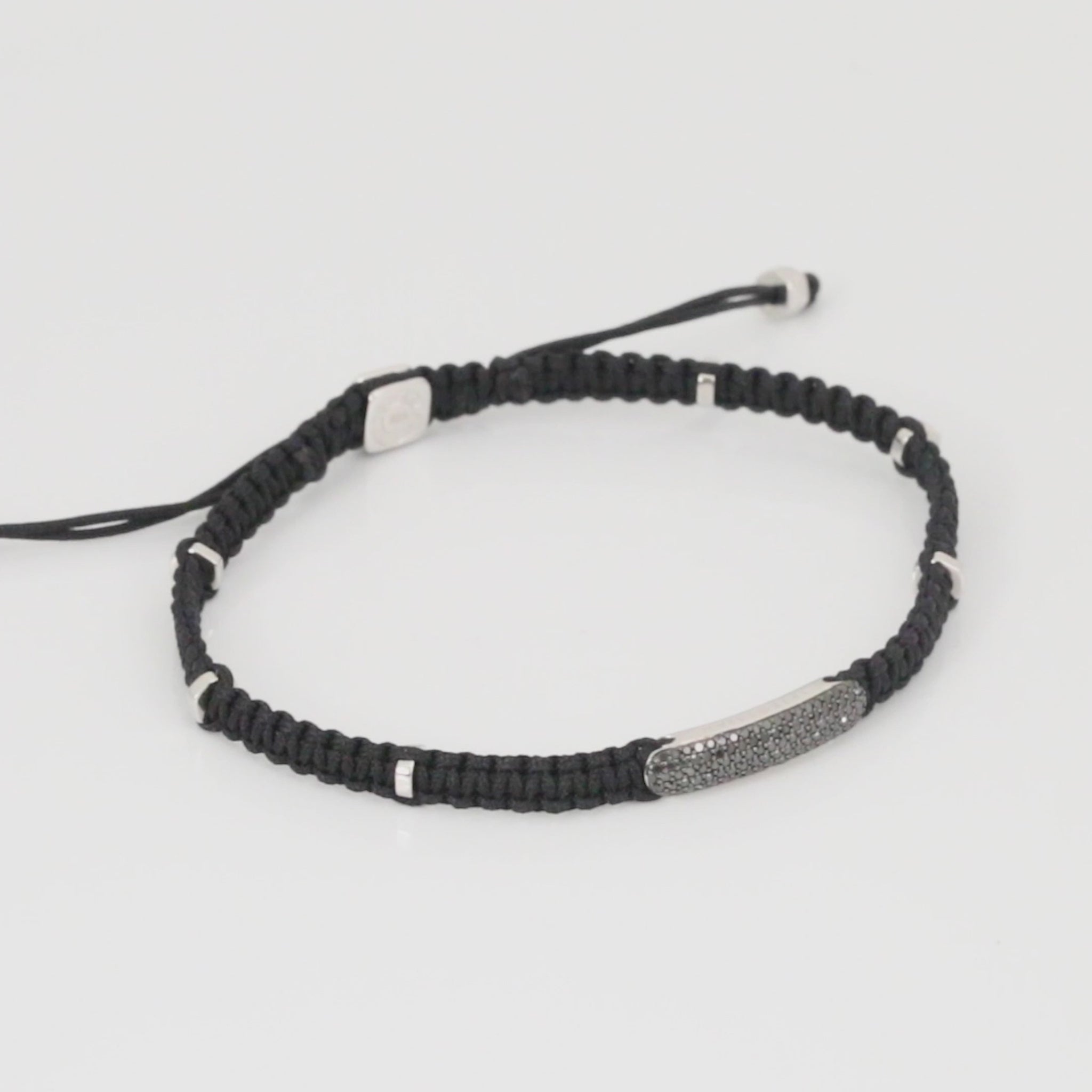99 single-cut black pave set diamonds sit within our rhodium-plated, sterling silver frame with silver disc elements added around the bracelet, to give little flashes of light throughout the design. Our intricately hand-wrapped black macrame is made to adjust in size. To open, simply pull the two ends of the bracelet away from one another.
