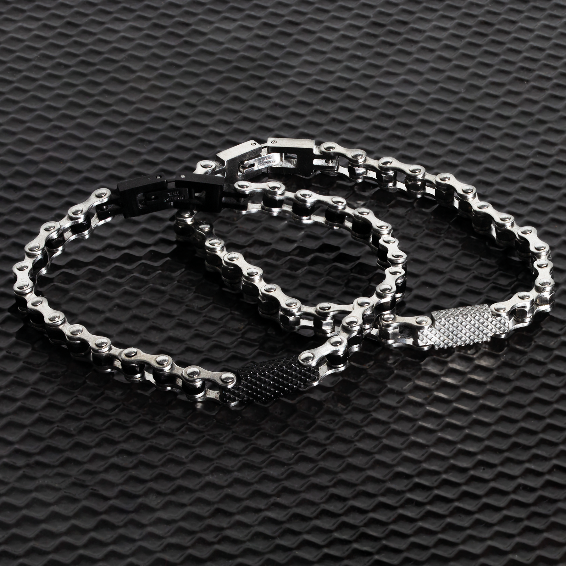 Designed with a secure latch clasp, these Bike Chain bracelets feature interlocking 6mm links in either brushed stainless steel or matte black IP-plated steel. A central ID plate is engraved with Tateossian’s signature diamond pattern, adding subtle detail and texture. The articulated construction offers comfort and a refined, mechanical edge to everyday style.