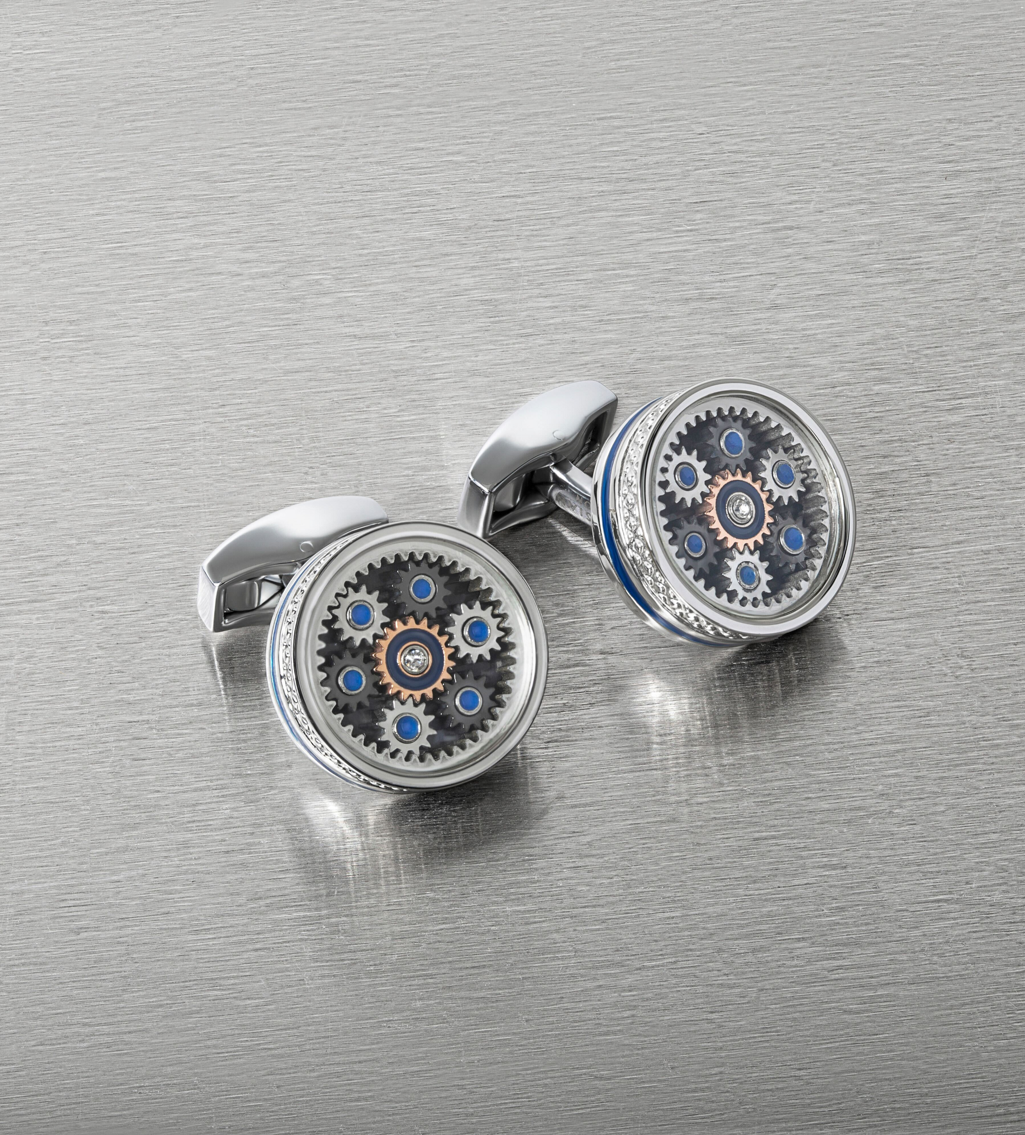 Quadrato Gear Cufflinks With Blue Enamel In Palladium Plated