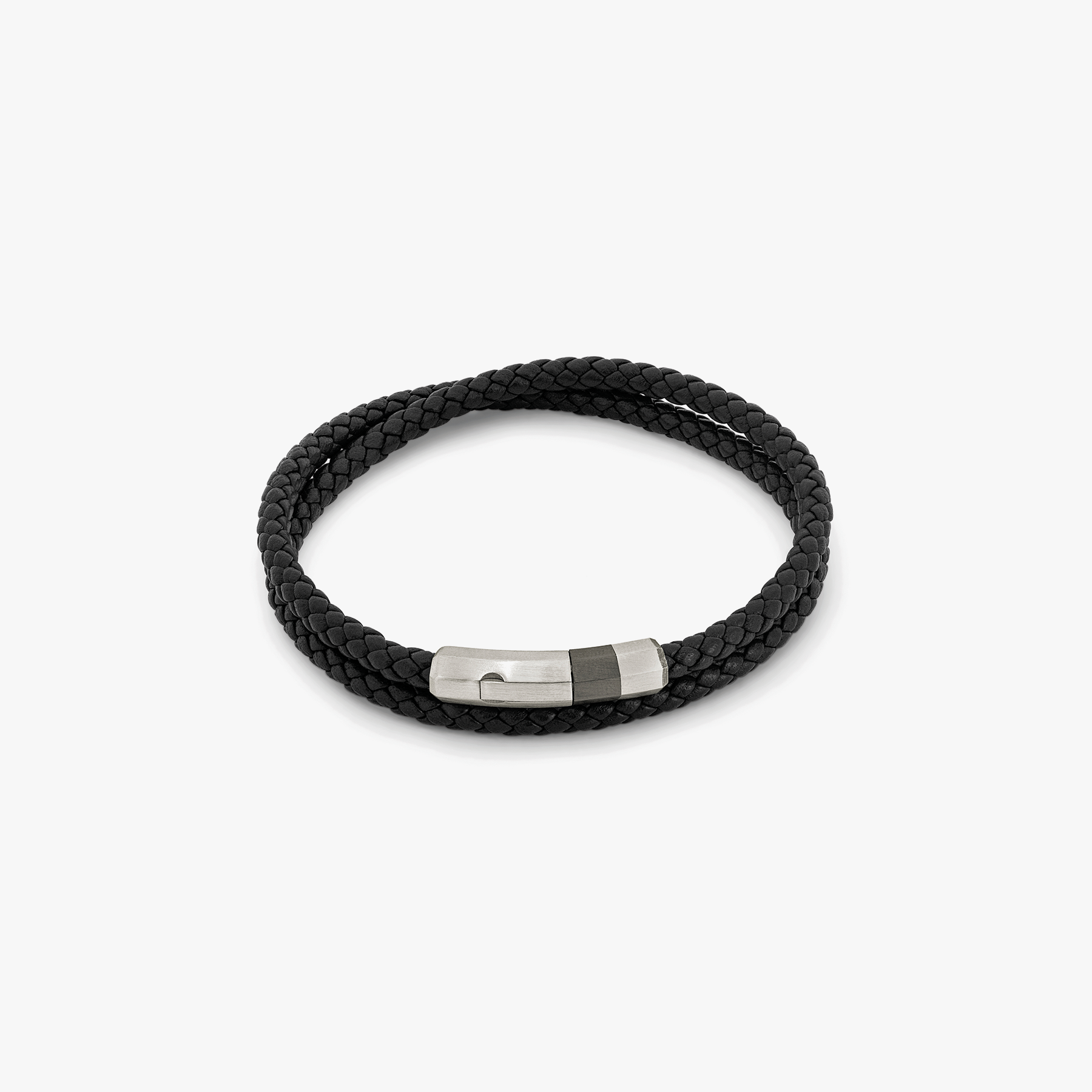 Industrial with a contemporary style, this bracelet features an octagonal-shaped seamlessly flush clasp manufactured in Italy, with a two-tone rhodium and black ruthenium finish and an easy-to-use button closure, finished in rhodium-plated sterling silver with braided Italian 4mm leather in black tones. Available in medium (39.5cm) and large (41.5cm) lengths
