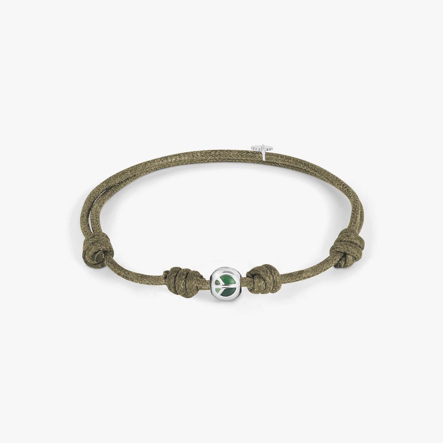 Protective Wax Cord Peace Bracelet In Rhodium Plated Sterling Silver With Green Enamel